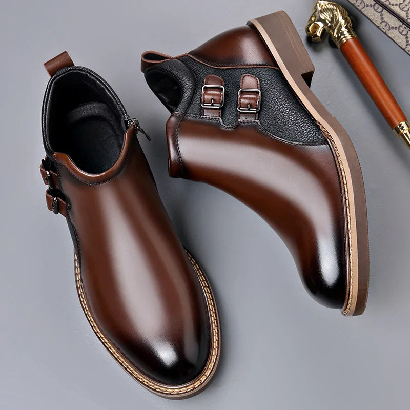 Crafted from premium genuine leather, the Dana Leather Boots showcase a refined ankle-height silhouette with a smooth, polished finish and subtle buckle detailing. Built on a supportive, cushioned sole, they deliver lasting comfort and quality construction designed for everyday wear with a more elevated edge.